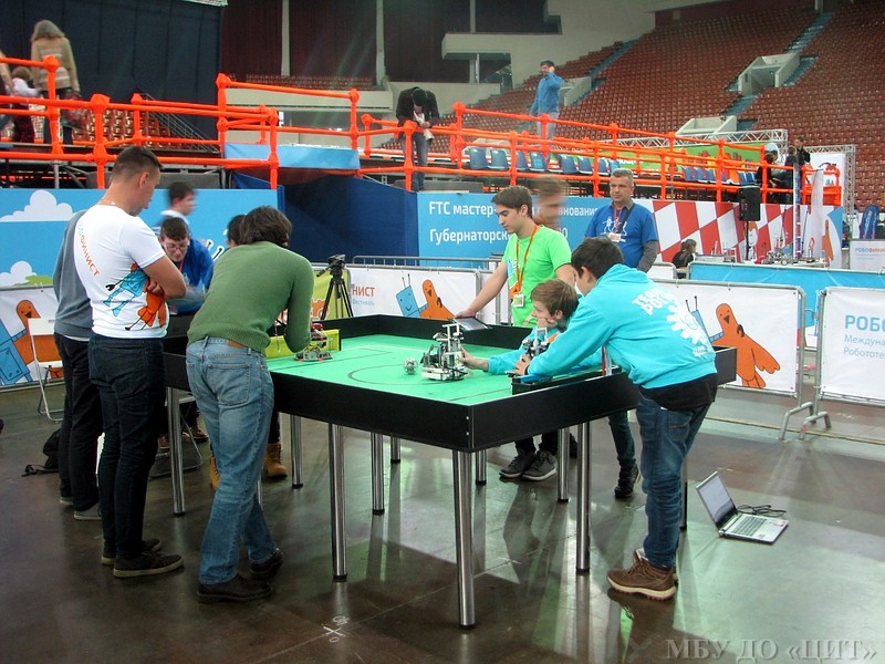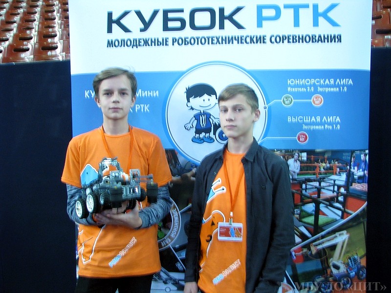 Еще одна команда (Бережков Андрей и Сабанцев Кирилл) принимала участие в «Кубке РТК». Отбор на этот вид был еще серьезней, чем в творческой категории. Всего в финал было допущено 40 команд, а заявок было подано 70. В финальной части роботам предстояло преодолеть сложный полигон с препятствиями. Наша команда не смогла войти в число победителей, но ребята получили бесценный опыт и уже готовы конструировать нового робота-вездехода.