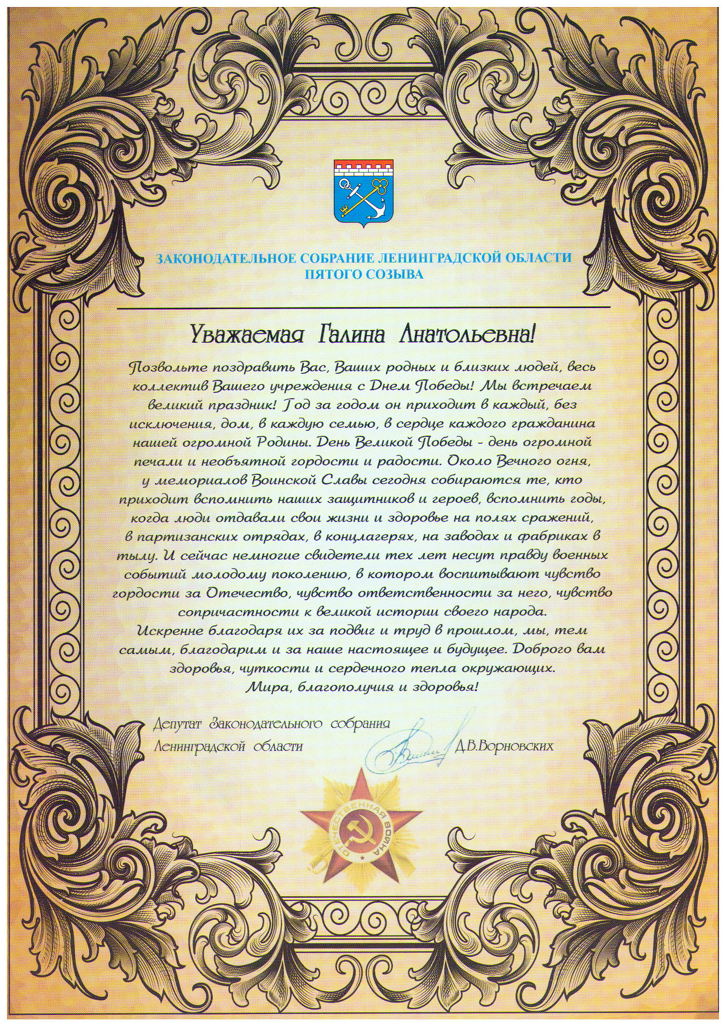 Поздравление депутата Законодательного собрания Ленинградской области Д.В. Ворновских