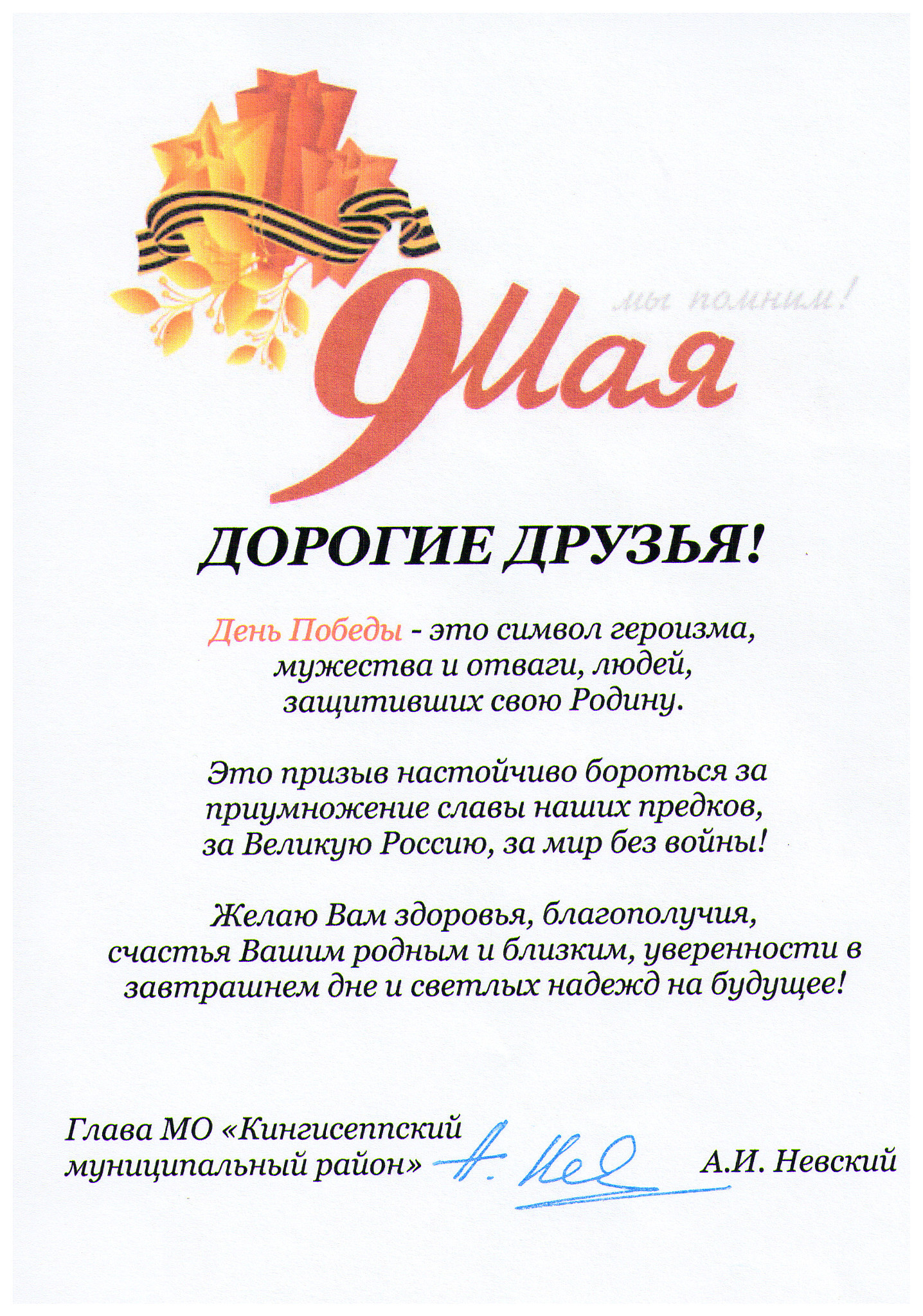 Поздравление главы МО "Кингисеппский муниципальный район" А.И. Невского