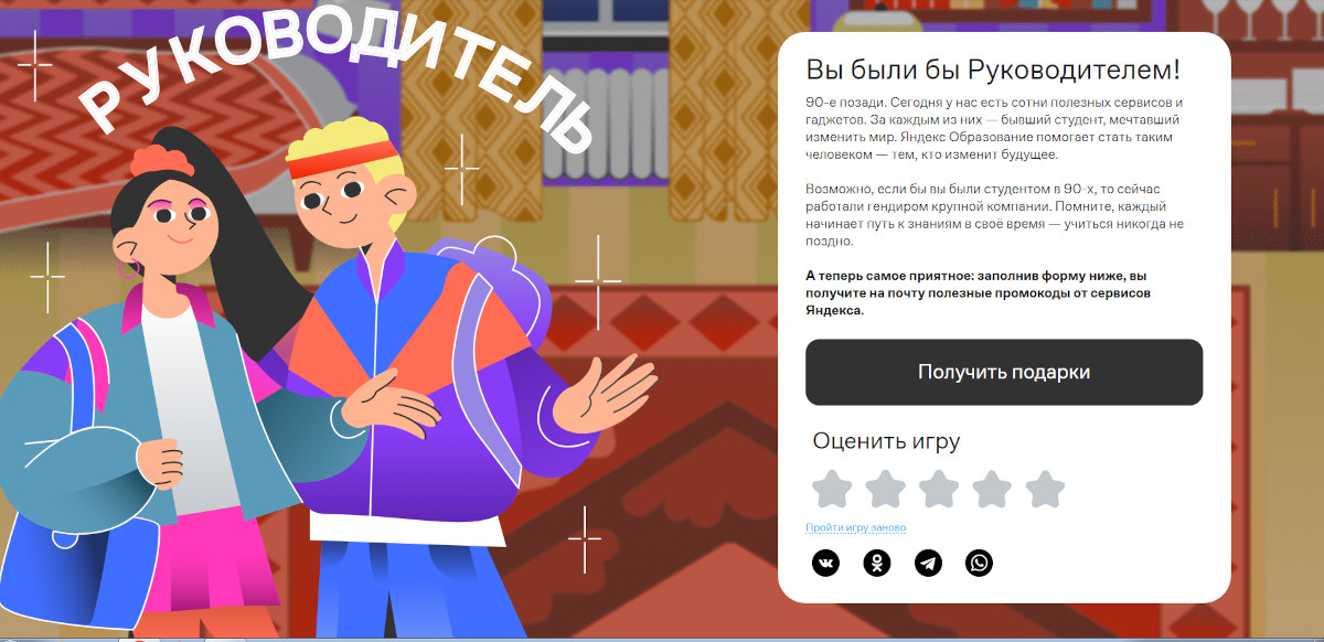 Яндекс Образование заколлабились с Плюсом, Маркетом и другими сервисами Яндекса, чтобы приготовить для нас онлайн-квест. Во время него мы перенеслись на 30 лет назад и прожили день студента из 90-х.